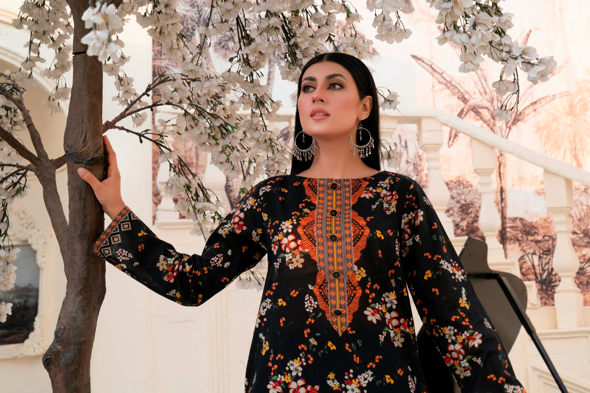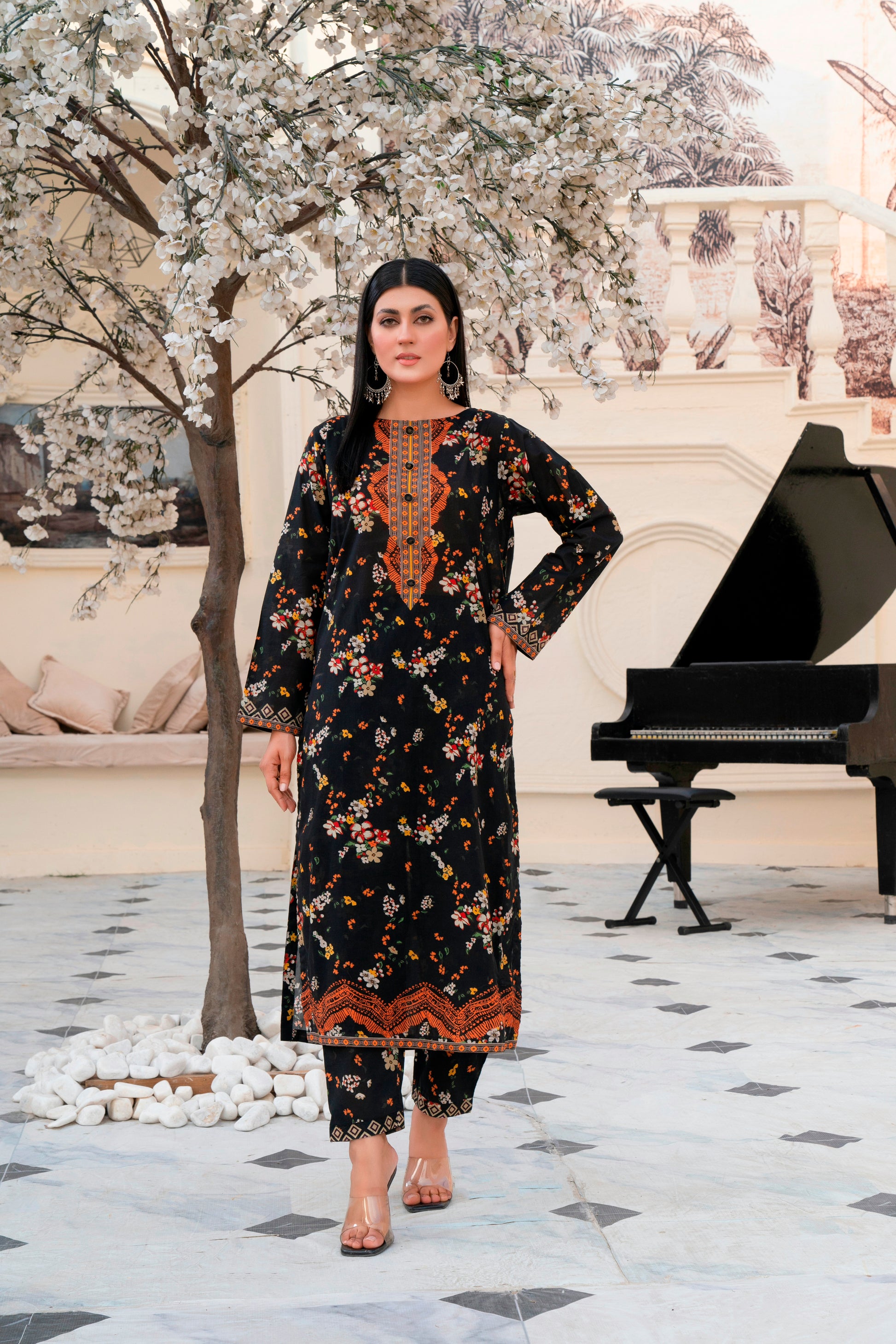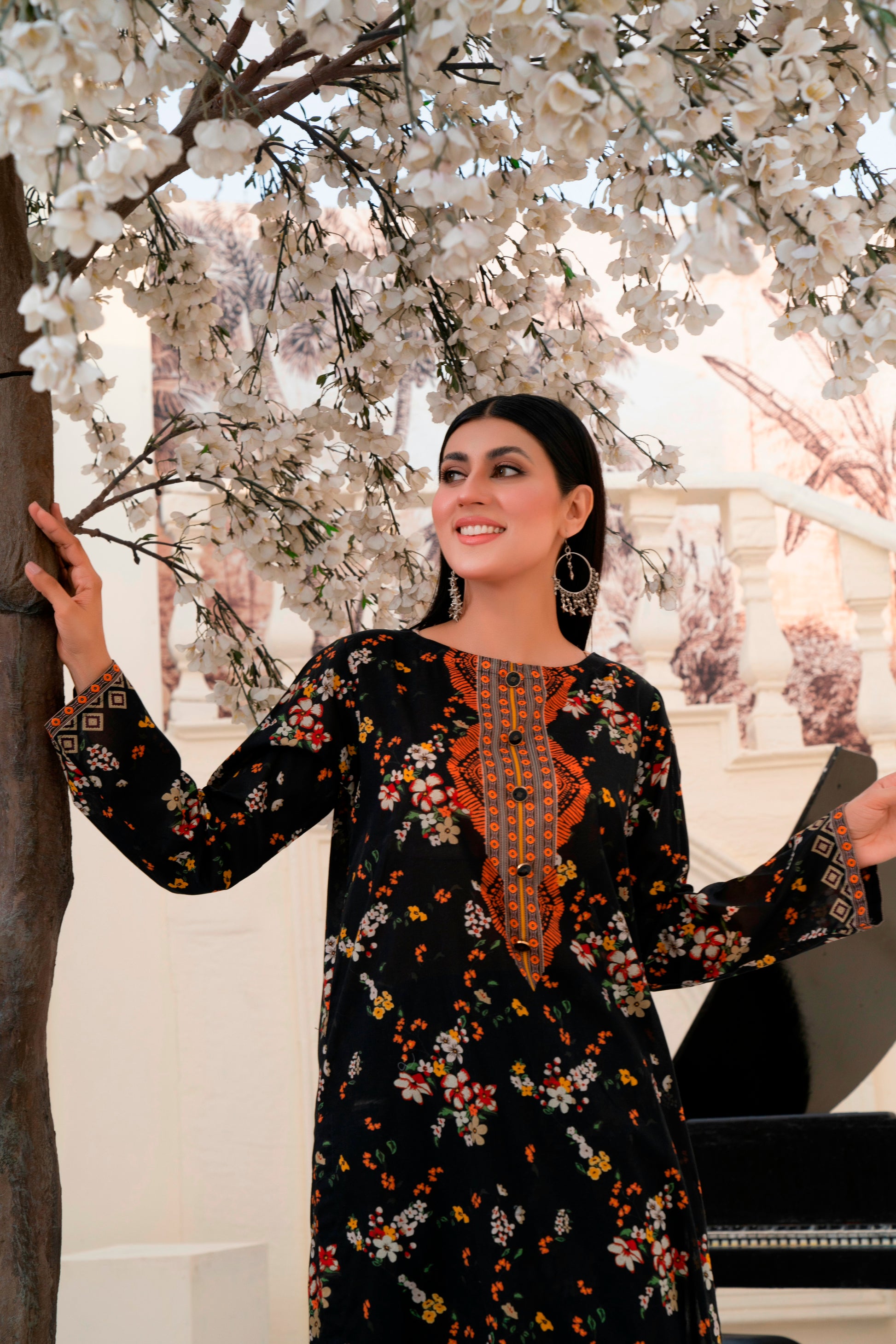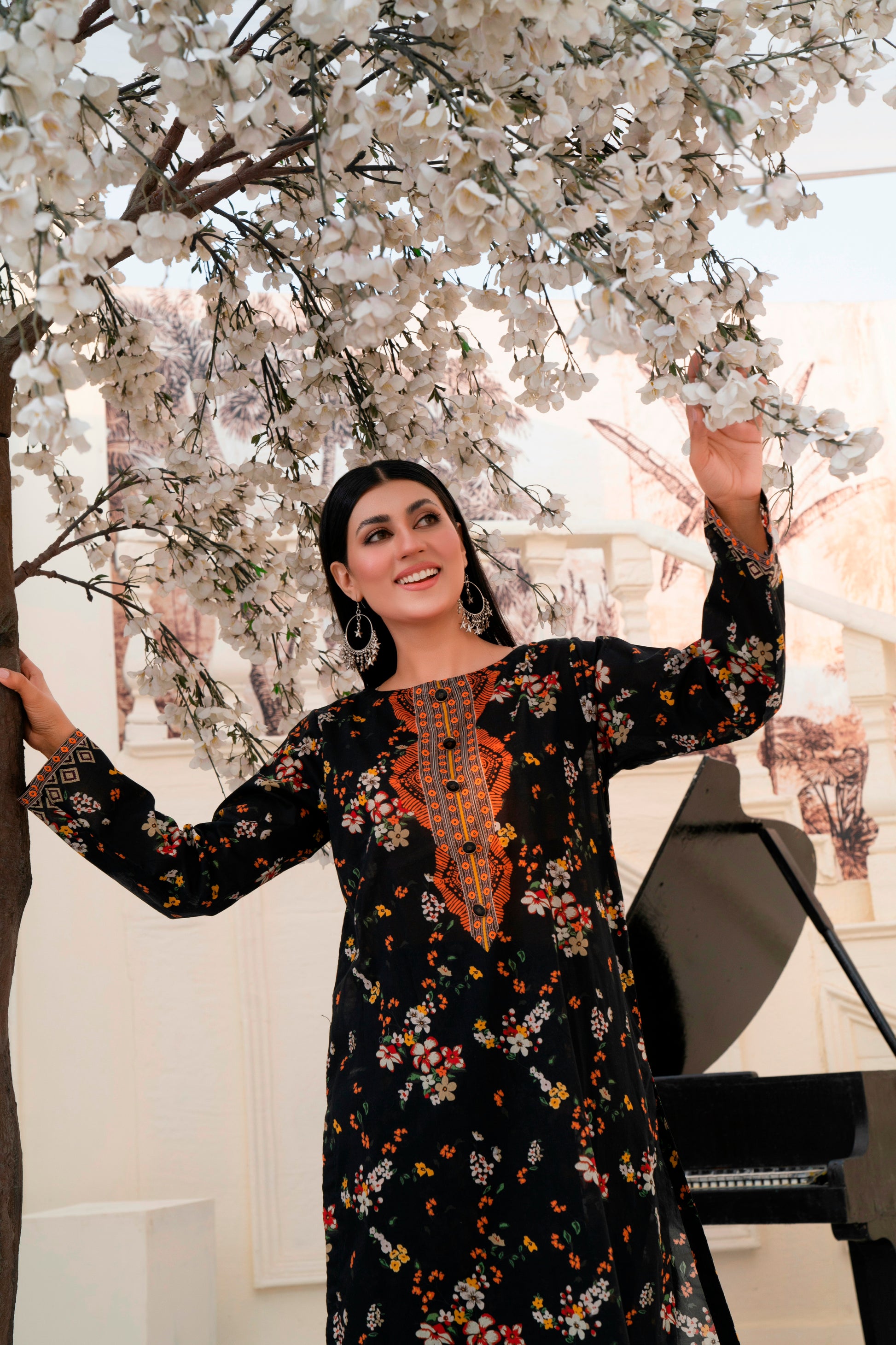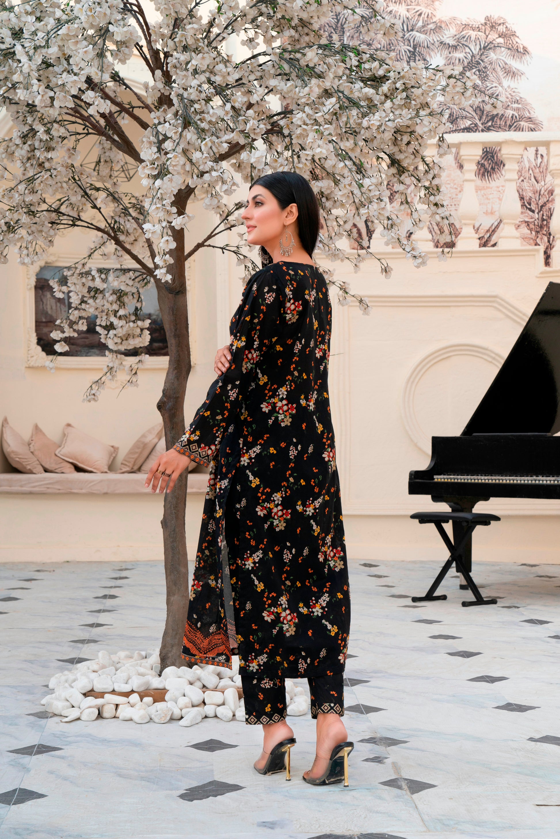 A beautiful contrast of floral print on black for an elegant yet youthful look. Two piece printed design on premium lawn with embellishments on neckline combined with straight fit trouser.