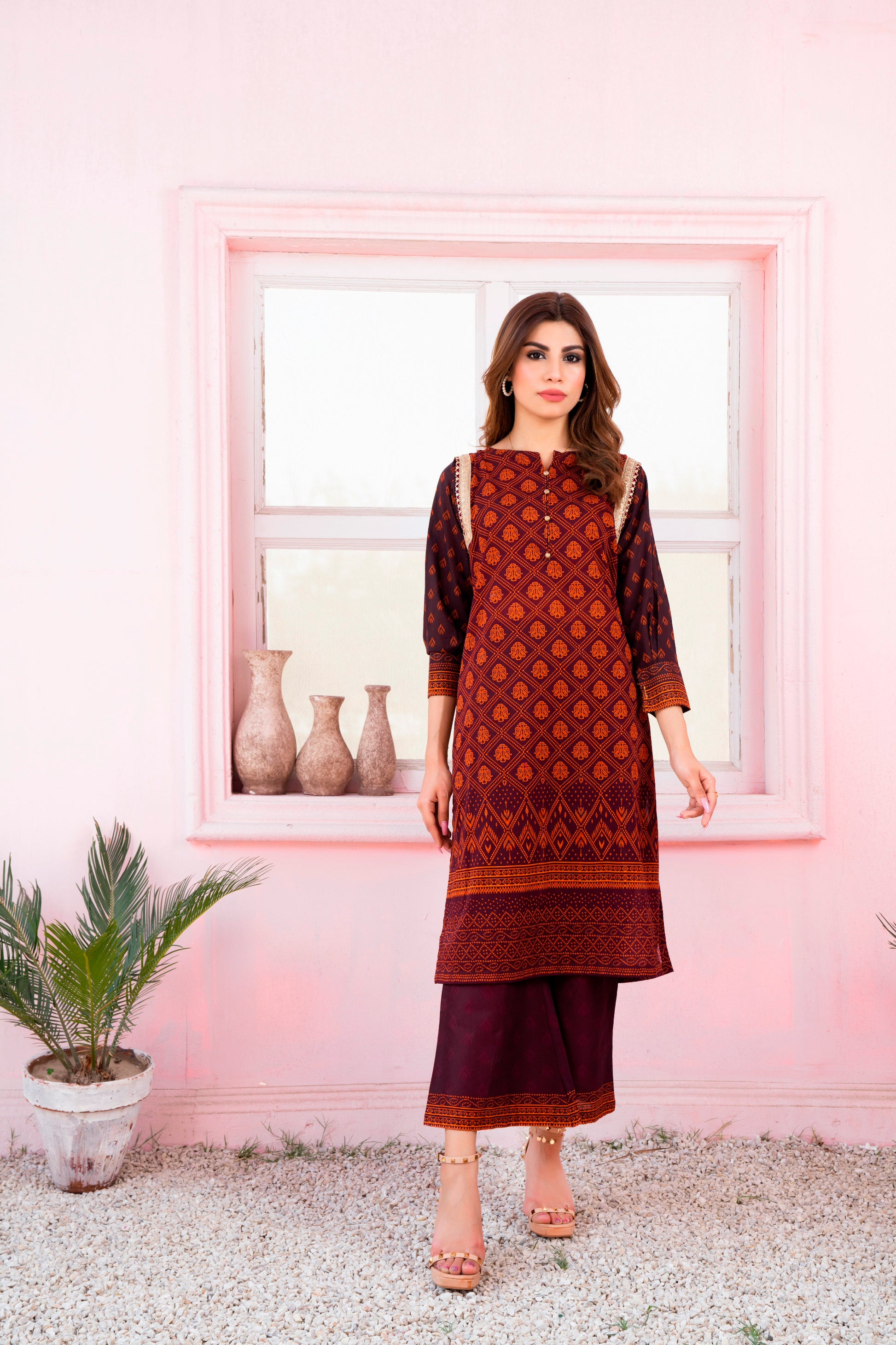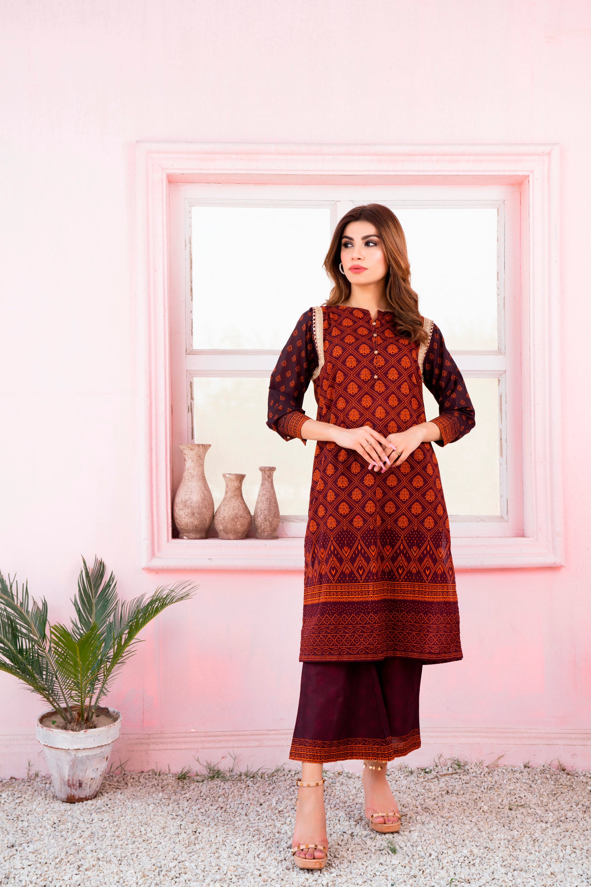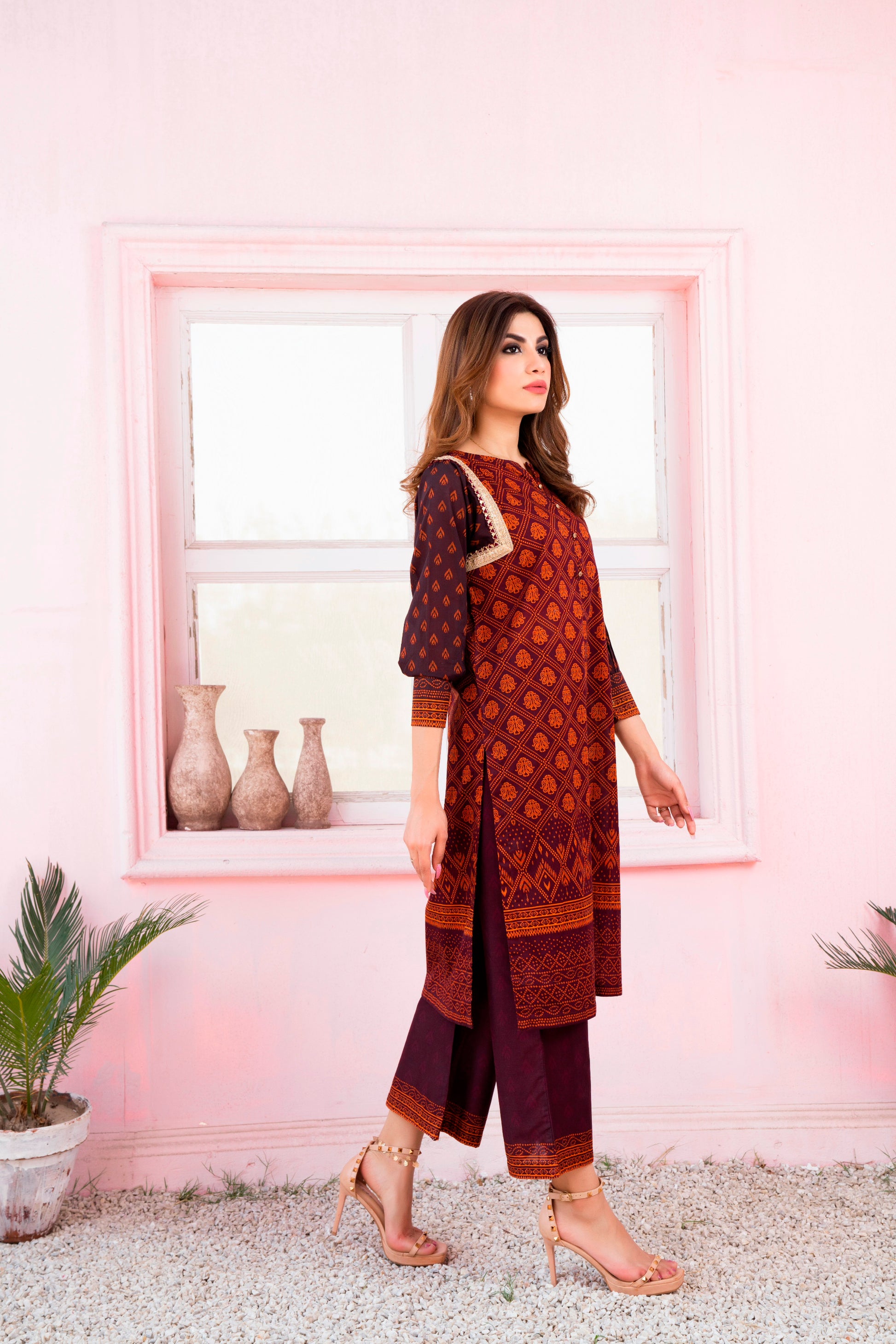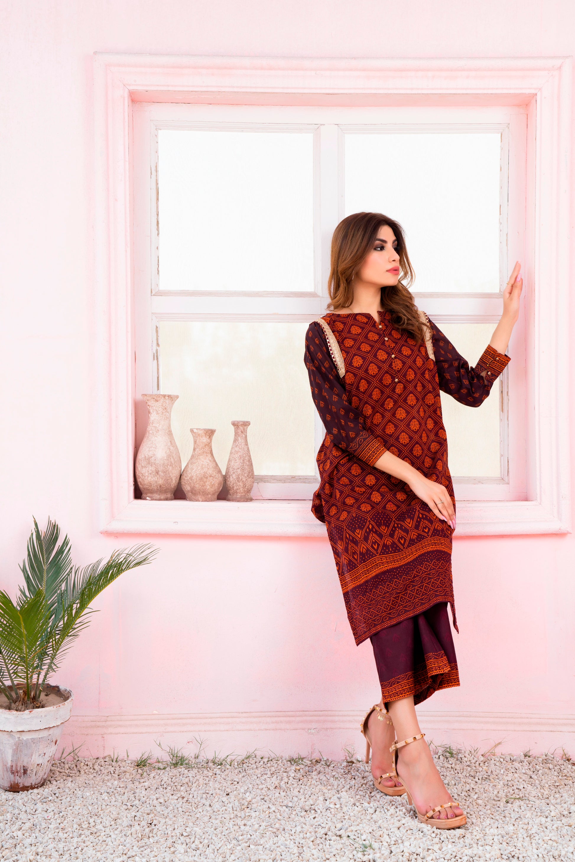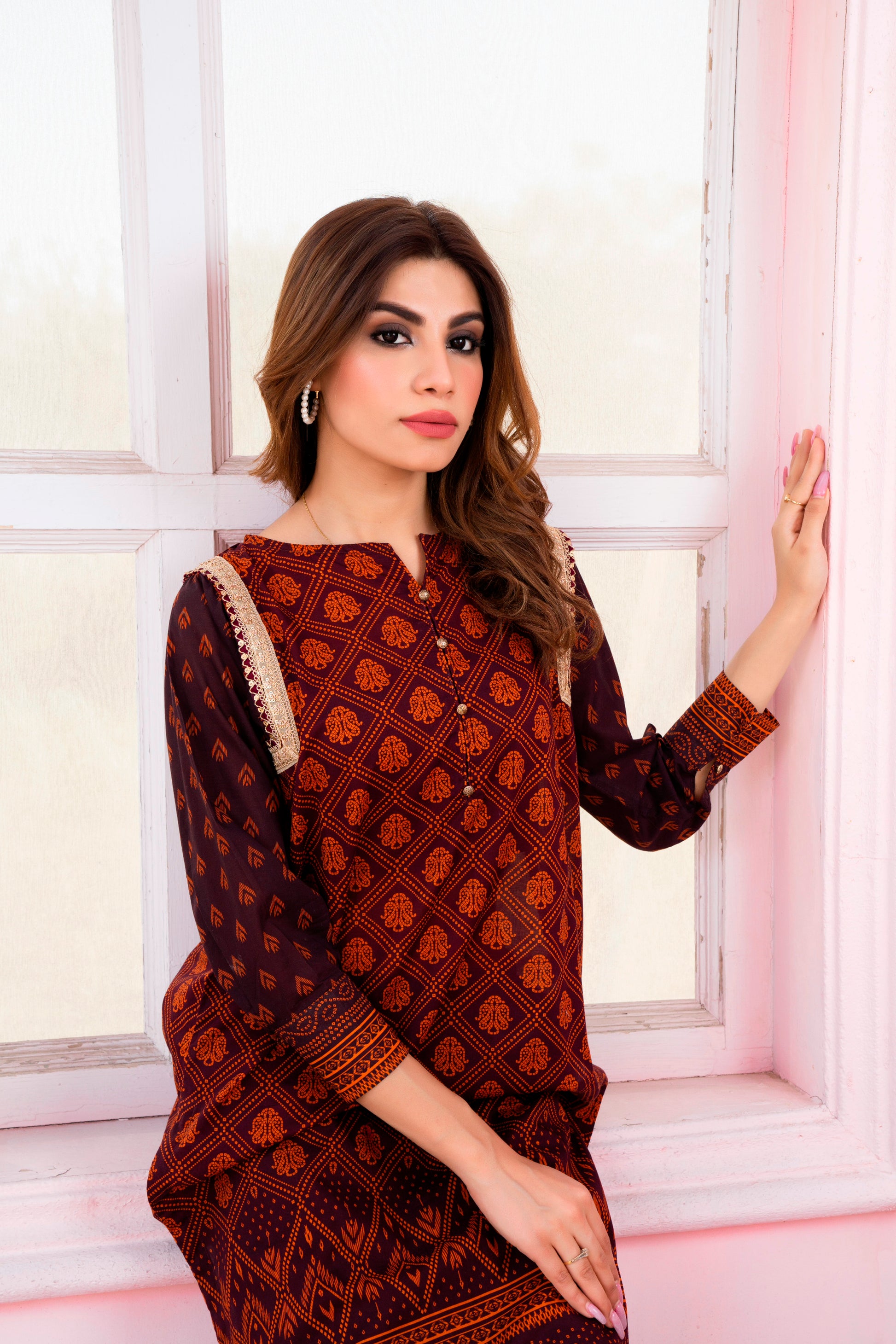 A combination of traditional chunri design in a modern colour combination of rust and maroon. Two piece printed design on premium lawn with embellishments on front combined with straight fit trouser.